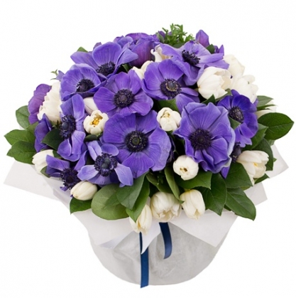 Красивые и нежные анемоны, их мягкие оттенки цвета прекрасно сочетаются с белыми тюльпанами. Для обеспечения пышности в букет добалена зелень.