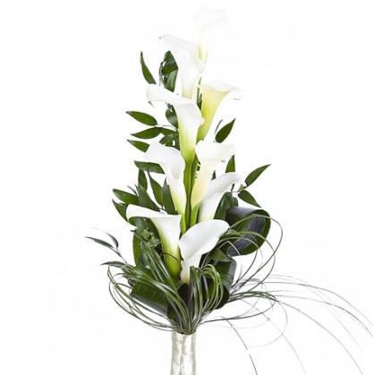 Букет из калл, аспедистры и берграсса с добавлением рускуса