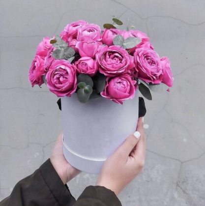 Шляпная коробочка с пионовидными кустовыми розами и эвкалиптом