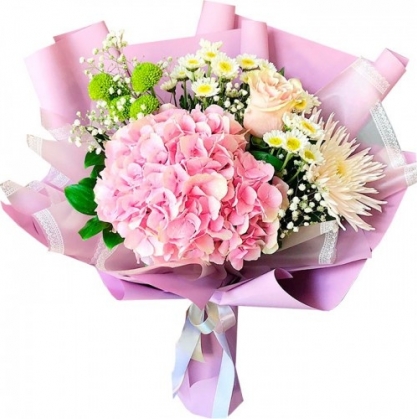 Красивый букет из гортензии с добавлением розы, хризантемы, рускуса, сантини и гипсофилы, в стильной и красивой упаковке