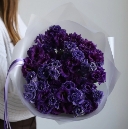 Букет из фиолетовых и сиреневых лизиантусов в стильной матововй упаковке