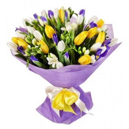 Букет "Три желания" из тюльпанов, ирисов и фрезии | Купить в Наро-Фоминске