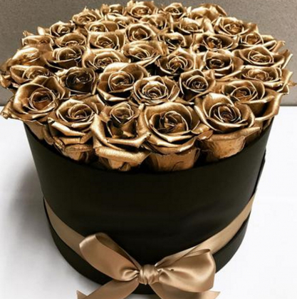 Шляпная коробка с золотыми розами. Внимание! Розы окрашиваются специальным составом, требуют особого ухода и имеют специфический запах. Предзаказ обязятелен!